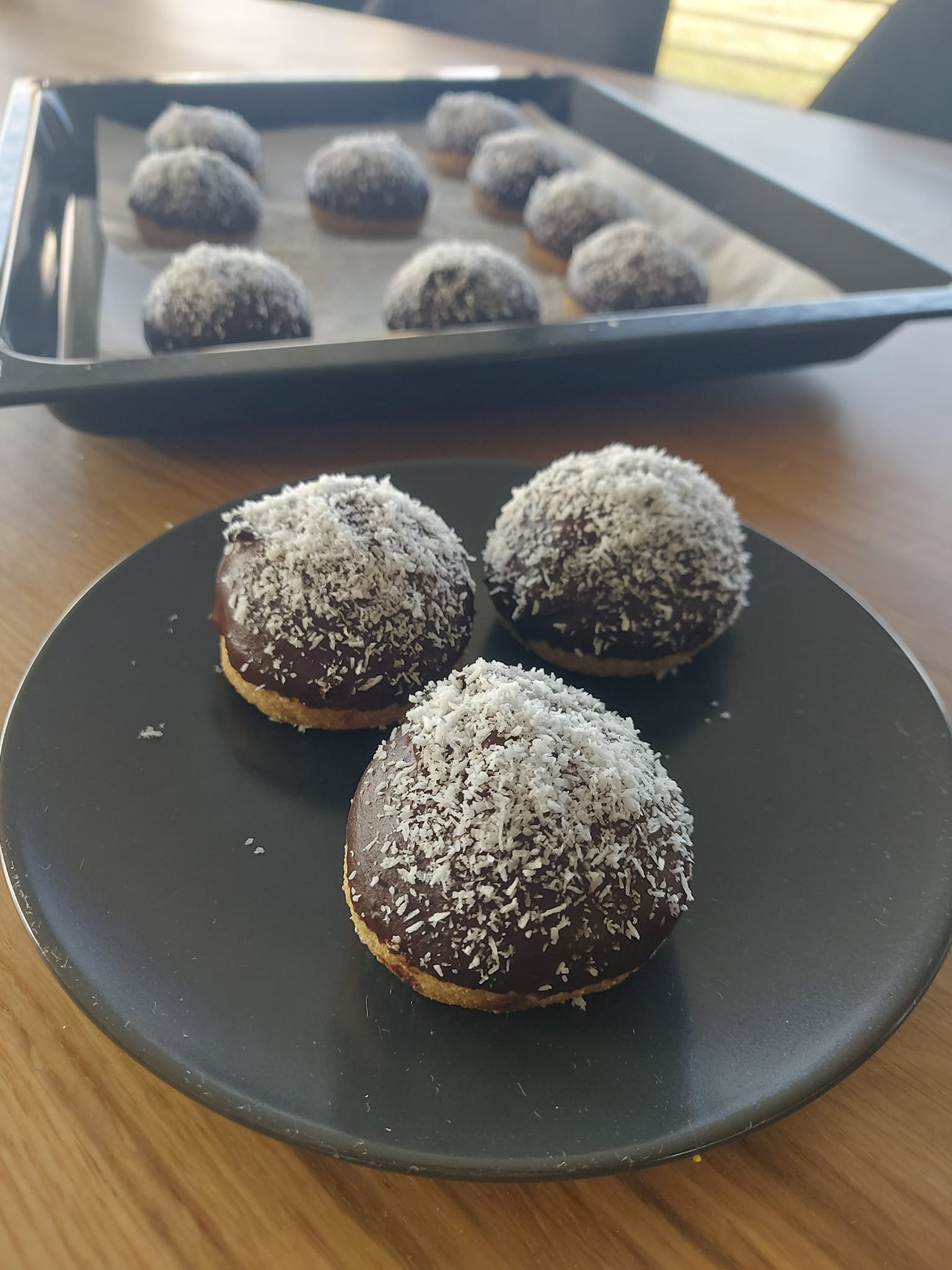 5. Zgornji del ohlajenih krofov pomočimo v pripravljeno čokolado in posujemo z grobo kokosovo moko/kosmiči.