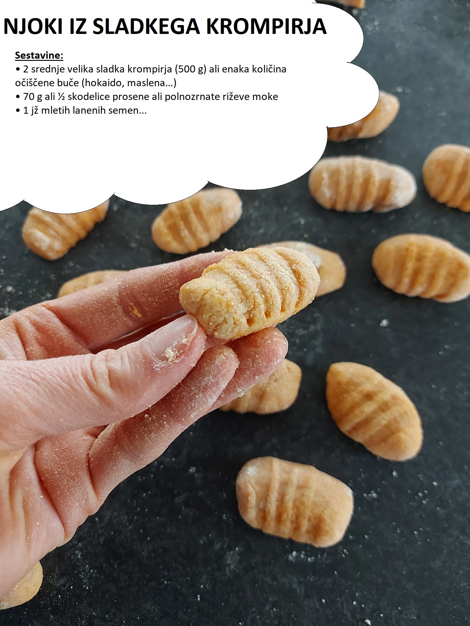 - 120 g ali ¾ skodelice in 1 ½ jž prosene, polnozrnate riževe ali ajdove moke (proseno moko lahko sami zmeljemo iz prosene kaše v močnejšem blenderju ali s kavnim mlinčkom)